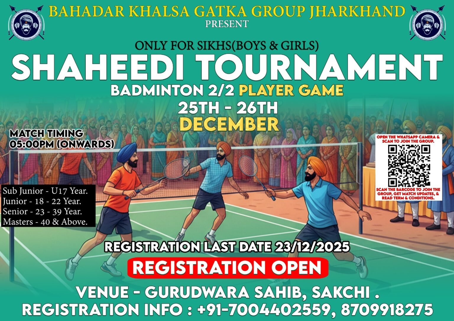 जमशेदपुर में बहादर खालसा गतका ग्रुप साकची और साकची गुरुद्वारा प्रबंधक कमेटी झारखंड की ओर से शहीदी बैडमिंटन टूर्नामेंट का भव्य आयोजन 25 व 26 दिसंबर को साकची गुरुद्वारा के गुरुनानक हाई स्कूल में किया जा रहा है. आयोजकों ने बताया कि फॉर्म भरने की तारीख 16 से 24 दिसंबर तक है. फॉर्म जिसे भी लेना है वो शाम 5:30 से 7:30 बजे तक साकची गुरुनानक हाई स्कूल में आके ले सकता हैं.