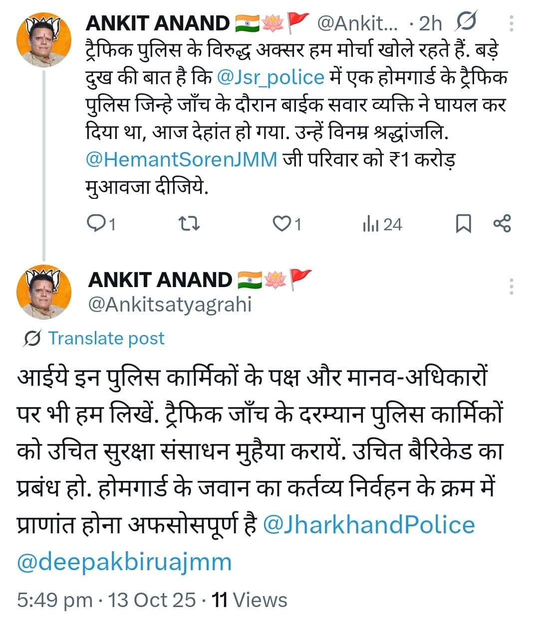जमशेदपुर में ट्रैफिक जांच के दौरान घायल हुए होमगार्ड जवान की मौत पर भाजपा नेता अंकित आनंद ने गहरा शोक व्यक्त किया है। उन्होंने अपने सोशल मीडिया हैंडल ट्विटर पर मुख्यमंत्री हेमंत सोरेन, परिवहन मंत्री दीपक बिरुआ और पुलिस मुख्यालय को टैग करते हुए लिखा कि सरकार मृतक के परिजनों को ₹1 करोड़ का मुआवजा दे।