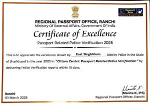जमशेदपुर में पूर्वी सिंहभूम जिले की पुलिस को वर्ष 2025 में पासपोर्ट सत्यापन के क्षेत्र में उत्कृष्ट प्रदर्शन के लिए सम्मानित किया गया है। जिले में वर्ष 2025 के दौरान कुल 26,852 पासपोर्ट आवेदनों का समयबद्ध और प्रभावी ढंग से सत्यापन किया गया। औसतन 9.42 दिनों के भीतर सत्यापन की प्रक्रिया पूरी कर ली गई, जो एक उल्लेखनीय उपलब्धि मानी जा रही है।