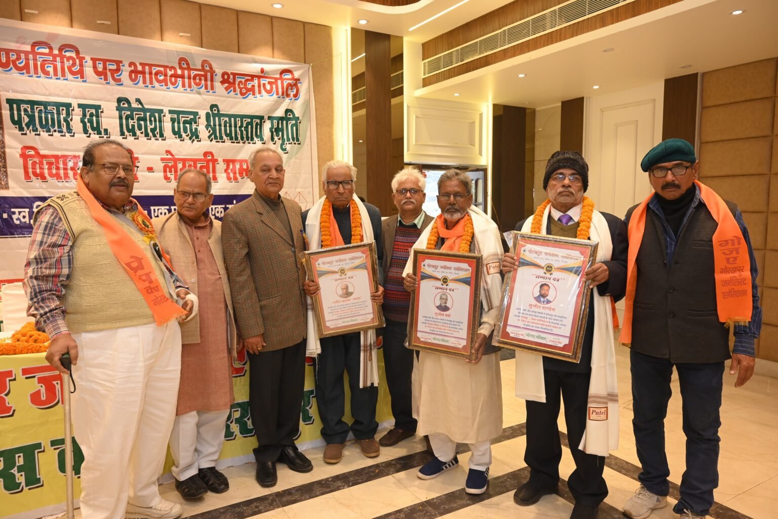 इस दौरान स्वर्गीय दिनेश के छोटे भाई अरुण कुमार श्रीवास्तव पुत्र मनीष और आशीष को अंग वस्त्र और स्मृति चिन्ह देकर सम्मानित किया गया. स्वर्गीय श्रीवास्तव के स्मृति में गोरखपुर के वरिष्ठ पत्रकार जमीर अहमद पयाम, सुशील वर्मा और सुजीत पांडे को स्वर्गीय दिनेश चंद्र श्रीवास्तव स्मृति लेखनी सम्मान से विभूषित किया गया.