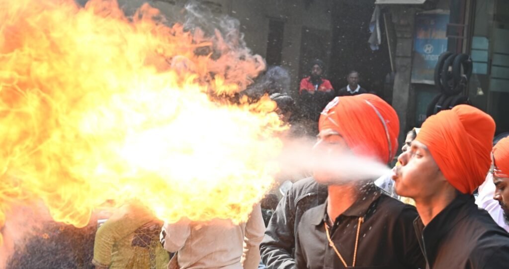 एक नन्हा बच्चा निशान साहिब लेकर सबसे आगे चल रहा था उसके बाद माता साहिब कौर गतका ग्रुप और बहादर खालसा गतका ग्रुप ने अपने गतका के हैरतअंगेज़ प्रदर्शन से संगत को अचंभित किया।