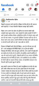 उन्होंने लिखा है कि लोग बिहारियों के ट्रेन में लटक कर आने की बात कह रहे हैं। बिहारियों के लिए ट्रेन बढ़ाने की जरूरत हो रही है. आज हवाई यात्रा का किराया तीन से चार गुना बढ़ गया है तो भी लोग आ रहे हैं. अगर हवाई जहाज में खड़ा होकर आने की व्यवस्था होती तो भी आते। सुधांशु ओझा का तर्क है कि बिहारी ऐसा करते है क्योंकि वे अपने धर्म को मानते हैं.