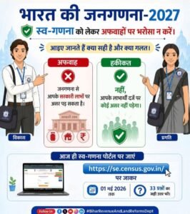 उन्होने बताया कि इस चरण से पूर्व आम नागरिकों की सुविधा हेतु स्व-गणना Self Enumeration) की व्यवस्था एक विशेष पोर्टल के माध्यम से दिनांक 01.05.2026 से 15.05.2026 तक उपलब्ध रहेगी। उन्होंने सभी नागरिकों से अपील की कि वे https://se.census.gov.in पर जाकर इस सुविधा का अधिकाधिक उपयोग करते हुए निर्धारित अवधि में अपनी जानकारी स्वेच्छा से दर्ज करें।