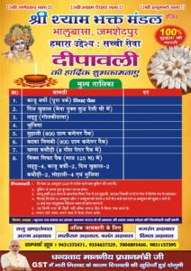 जमशेदपुर शहर की सामाजिक और धार्मिक संस्था श्री श्याम भक्त मंडल दीपवाली के अवसर पर समाज के सभी वर्गो की सुविधा हेतु सस्ती व अच्छी मिठाई और नमकीन बनयाएगी. मंडल के संयोजक पवन अग्रवाल के अनुसार बाजार मूल्य से काफ़ी कम दर पर काजू बर्फी, लड्डू, दिलखुसार, भुजिया, निमकी सहित अन्य समान उपलब्ध कराने का विचार मंडल ने लिया है.