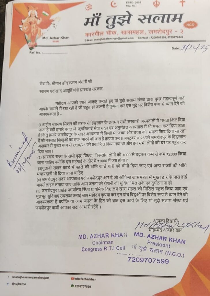 जमशेदपुर की संस्था मां तुझे सलाम संस्था द्वारा पांच सूत्री ज्ञापन स्वास्थ्य/ खाद आपूर्ति मंत्री डॉ इरफ़ान अंसारी को उनके शहर आगमन पर पांच सूत्री मांग पत्र सौंपा गया. इसके तहत स्वास्थ्य मंत्री से कहा गया कि राष्ट्रीय स्वास्थ्य मिशन के तरफ से नवजात शिशु को ममता किट दिया जाता है, किंतु हमारे जमशेदपुर सदर अस्पताल में जच्चा और बच्चा को ममता किट नहीं दिया जाता है. झारखंड राज्य के सभी वृद्धा, विधवा, विकलांग लोगों को 1000 से बढ़ाकर कम से कम ₹2000 किया जाना चाहिए क्योंकि इस महंगाई के दौर में 1000 में किसी का घर नहीं चलेगा.