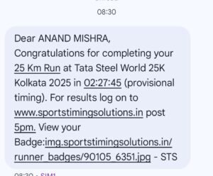 जमशेदपुर से शौकिया स्तर पर मैराथन की दौड़ लगाने वाले पुलिस निरीक्षक शहर थाना प्रभारी साकची आनंद मिश्रा ने कोलकाता में टाटा स्टील द्वारा प्रायोजित टाटा स्टील 25 किलोमीटर मैराथन में रविवार को दौड़े. उन्होंने 25 किलोमीटर की दूरी तय करते हुए 02:27: 45 घंटे में फिनिश लाइन को पार किया.