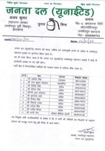जमशेदपुर में जनता दल (यूनाईटेड) के महानगर अध्यक्ष अजय कुमार ने पार्टी को सरल, सक्रिय एवं जनोन्मुखी बनाने के मकसद से महानगर ईकाई का पुर्नगठन किया है. यहां जारी एक विज्ञप्ति में उन्होंने स्पष्ट किया कि अब जनता दल (यूनाइटेड) में जमशेदपुर महानगर ईकाई में कार्यकारी अध्यक्ष का कोई पद नहीं होगा.