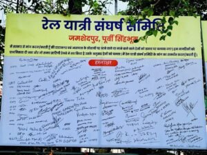 जमशेदपुर में भीषण गर्मी के बावजूद ट्रेनों की लेटलतीफी के विरुद्ध टाटानगर स्टेशन परिसर में रविवार को रेल यात्री संघर्ष समिति के तत्वावधान में हस्ताक्षर अभियान चलाया गया। तपती धूप में हस्ताक्षर अभियान की शुरुआत जमशेदपुर पश्चिम के विधायक सरयू राय ने खुद हस्ताक्षर करके की। इसके बाद रेल यात्रियों ने ह्वाइट बोर्ड पर हस्ताक्षर किये। लोगों ने स्वतःस्फूर्त भाव से हस्ताक्षर किये और कई लोगों ने तो उसी वक्त सोशल मीडिया पर वीडियो भी पोस्ट कर दिया।