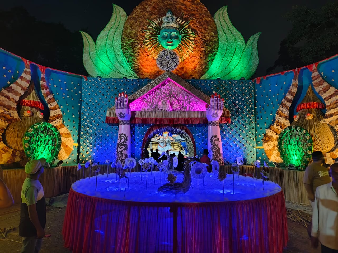 दिनेश ने बताया की पूजा पंडाल पूर्ण रूप से आदिवासी संस्कृति और परम्परा को दर्शा रहा है और जंगल संरक्षण का भी संदेश दे रहा है. पूर्व में यहां प्रसिद्ध शांता दुर्गा टेंपल ऑफ गोवा, नौलखा मंदिर, टोकरी से निर्मित पंडाल एवं अन्य समाज को संदेश देते हुए पंडाल का निर्माण किया गया है. मां दुर्गा की प्रतिमा भव्य और भावपूर्ण है. माता अपने सवारी शेर पर सवार है और शेर की आकृति को मूर्तिकार ने बड़ा रूप प्रदान किया है जो प्रतिमा की भव्यता को दर्शा रहा है.