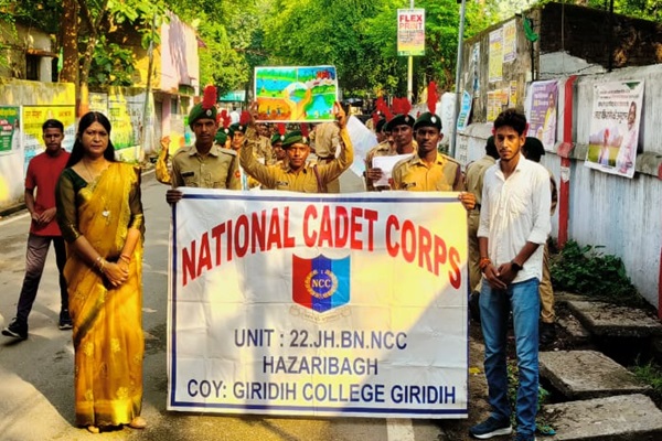 गिरिडीह कालेज के एनसीसी कैडेट्स ने प्रो विनीता के नेतृत्व में विश्व पर्यावरण दिवस के अवसर पर झंडा मैदान से टावर चौक तक हाथों में पर्यावरण जागरूकता के पोस्टर लेकर और नारों के साथ जागरूकता अभियान चलाया. इस दौरान लोगों को पर्यावरण संरक्षण और संवर्धन की अहमियत समझाई गई. अभियान के बाद गिरिडीह कालेज में पौधारोपण किया गया. प्रो विनीता ने कहा कि प्रधानमंत्री नरेंद्र मोदी द्वारा शुरू किए गए ‘एक पेड़ मां के नाम’ अभियान के तहत करोड़ों लोगों ने पौधा रोपण कर प्रकृति को सुरक्षित रखने का संकल्प लिया है. इस कार्यक्रम में प्रफुल्ल, सिया, विकास, नीरज, राहुल सहित लगभग 55 एनसीसी कैडेट्स मौजूद थे.