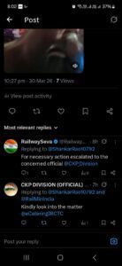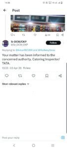 टाटा से घाटशिला जाने के क्रम में एम रवि शंकर राव ने चार दिन पूर्व एक शिकायत की थी. उनका अनारक्षित टिकट नंबर 73232131 था. रेल जीएम, रेल सेवा केंद्र आदि जिम्मेदार लोगों को शिकायत की गई थी. वहां से संज्ञान भी लिया गया. मामले की जांच करने के लिए सीकेपी डिवीजन के संबंधित अधिकारियों को कहा गया, जो ट्वीट (अभी एक्स) पर साफ देखा जा सकता है, लेकिन उसके बाद भी कोई कार्रवाई स्थानीय स्तर पर नहीं की गई.